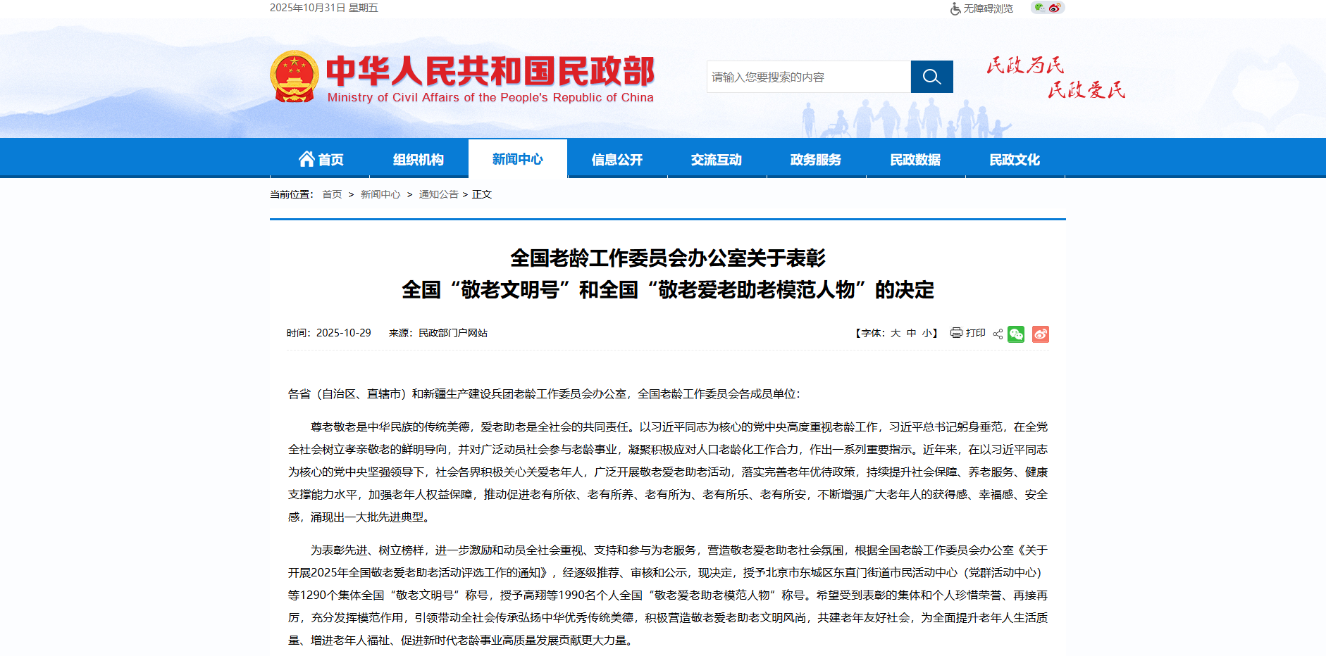 为表彰先进、树立榜样,进一步激励和动员全社会重视、支持和参与为老服务,营造敬老爱老助老社会氛围,全国老龄工作委员会办公室经逐级推荐、审核和公示,授予1290个集体全国“敬老文明号”称号,授予1990名个人全国“敬老爱老助老模范人物”称号。